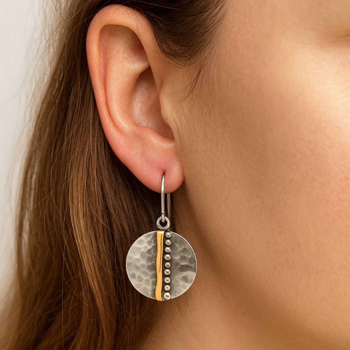 Ohrringe aus 925 Sterling Silber mit einem Mittelstreifen aus 333 Gelbgold. Die runde Form hat einen Durchmesser von 18 mm. Die Oberfläche ist dezent gehämmert, der goldene Streifen wird von kleinen Silberkügelchen begleitet.