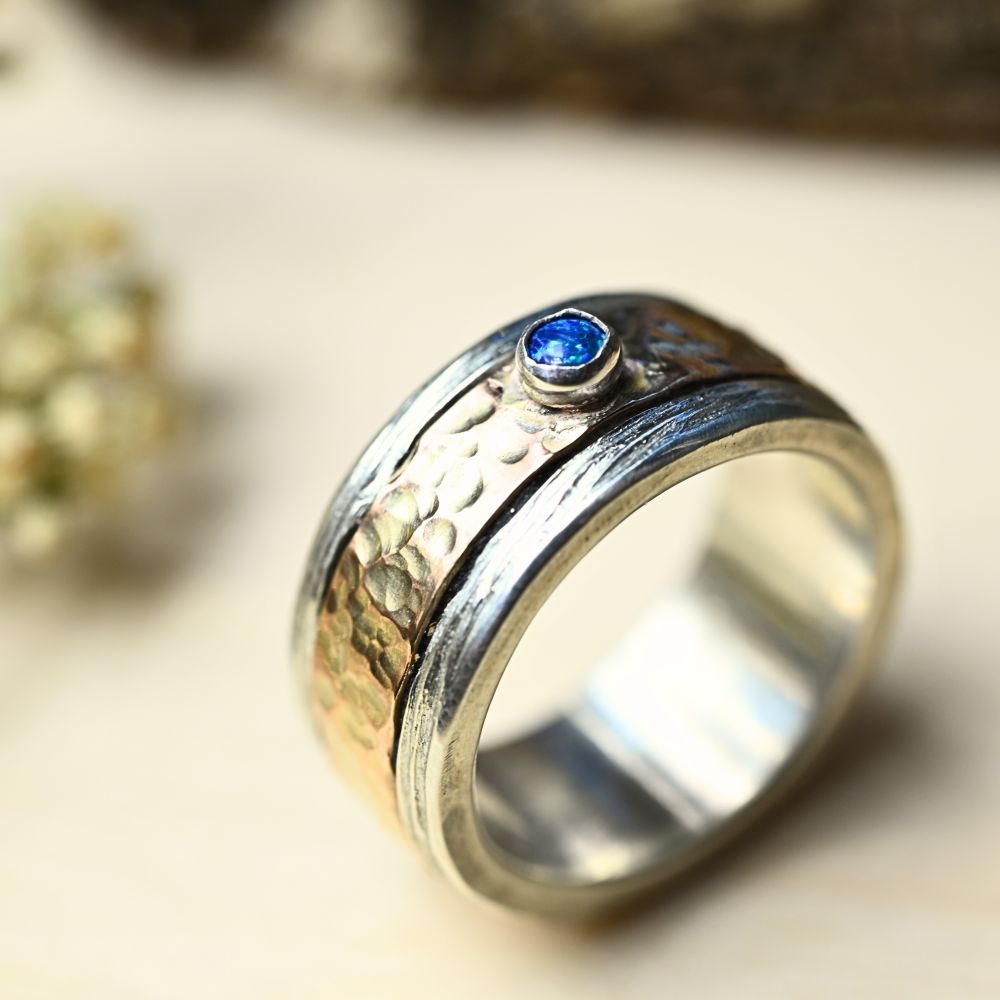 Dieser wunderbare Ring lebt von dem Kontrast zwischen silbernen und seinen goldenen Elementen. In der Mitte befindet sich ein gehämmertes Band aus 333er Gold, geschmückt mit einem zarten synthetischen Opal in leuchtendem Blau-Grün. Die Ränder des Bicolor-Rings weisen eine geriffelte Struktur auf. Der Grundring besteht aus 925er Sterling Silber.