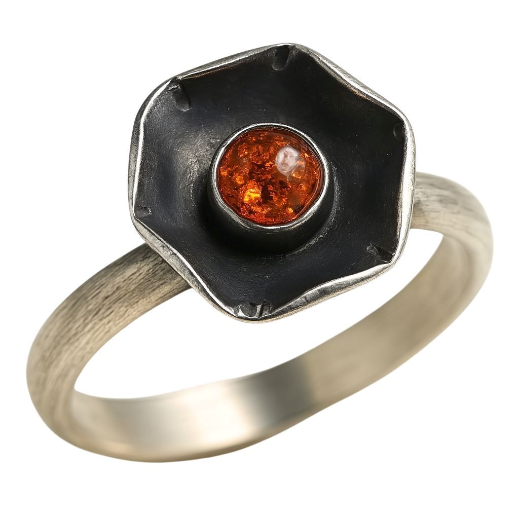 Ein charakterstarker Ring für alle, die das Besondere lieben: Dieser handgefertigte Damenring aus 925er Sterling-Silber besticht durch seinen ausdrucksvollen Look und die warme Ausstrahlung eines echten Bernsteins. Der runde Cabochon ist in eine schlichte Zargenfassung eingelassen und sitzt in einem blütenförmig geschmiedeten Ringkopf mit oxidierter Oberfläche.