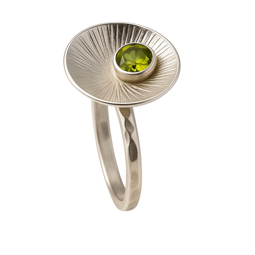 Dieser ausgefallene Damenring aus 925er Silber vereint eine gehämmerte Ringschiene mit einer strukturierten, leicht gewölbten Silberscheibe. Im Zentrum strahlt ein facettierter Peridot in leuchtendem Grün – eingefasst in eine schlichte Zargenfassung, die dem Edelstein maximale Präsenz verleiht. Der Ring ist ein stilvoller Begleiter für den Alltag oder ein besonderer Akzent zu festlichen Anlässen.