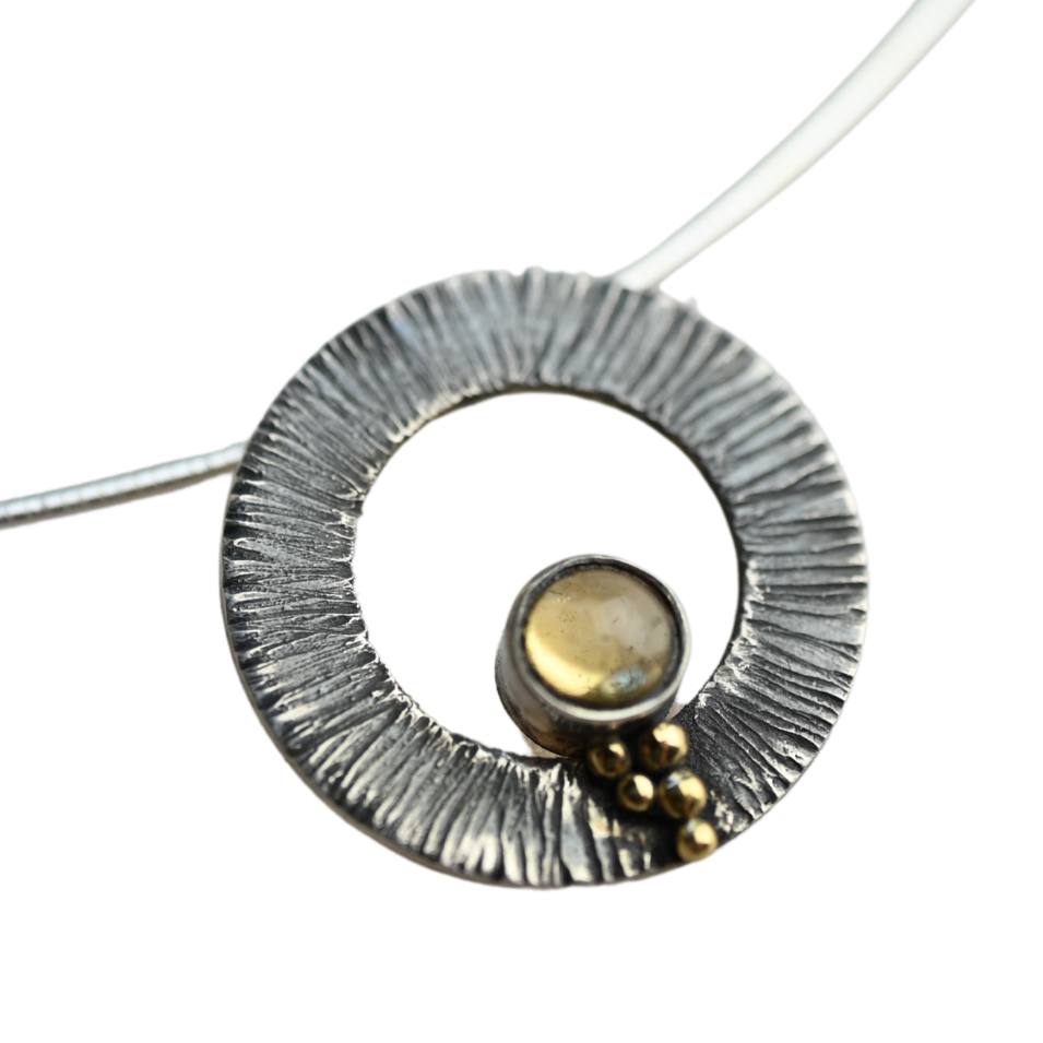 Unseren wunderbaren Anhänger aus 925er Sterling Silber zieren ein feines Riffelmuster, ein Lemon Quartz-Stein sowie kleine Kügelchen aus 750er Gold. Der passende Silberreif ist im Preis enthalten. Der Anhänger wird wie alle Tiljon-Schmuckstücke in unserer Werkstatt in Köln von Hand gefertigt.